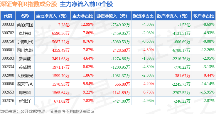 资金流向方面,深证专利R(470067)指数成份股当日主力资金净流出合计60.03亿元,游资资金净流入合计15.02亿元,散户资金净流入合计45.01亿元。成份股资金流向详情见下表:
