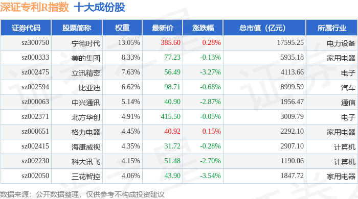 证券之星消息,11月11日,深证专利R(470067)指数报收于5972.22点,跌0.96%,成交706.24亿元,换手率1.36%。当日该指数成份股中,上涨的有13家,四川九洲以2.52%的涨幅领涨,下跌的有34家,三花智控以3.54%的跌幅领跌。