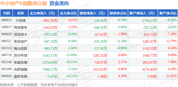 资金流向方面,中小地产R(471002)指数成份股当日主力资金净流出合计6.88亿元,游资资金净流入合计1.69亿元,散户资金净流入合计5.18亿元。成份股资金流向详情见下表: