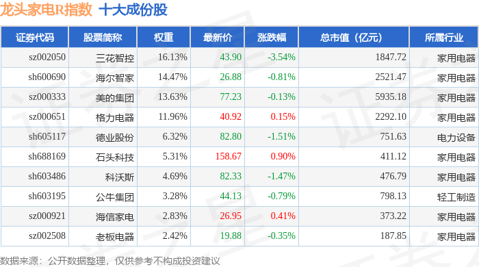 龙头家电R(480028)指数十大成份股详情如下: