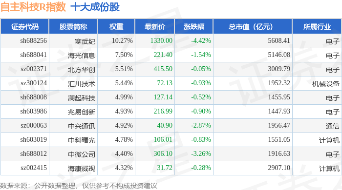 证券之星消息,11月11日,自主科技R(480033)指数报收于10037.87点,跌1.72%,成交714.42亿元,换手率1.39%。当日该指数成份股中,上涨的有4家,中航光电以1.08%的涨幅领涨,下跌的有46家,寒武纪以4.42%的跌幅领跌。