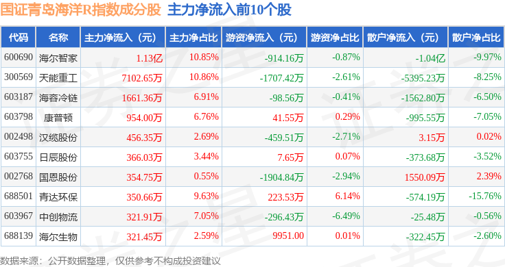 资金流向方面,国证青岛海洋R(480532)指数成份股当日主力资金净流出合计1.38亿元,游资资金净流入合计1420.92万元,散户资金净流入合计1.24亿元。成份股资金流向详情见下表: