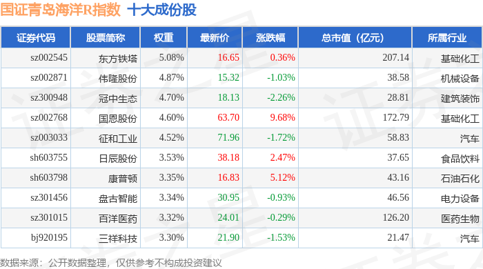国证青岛海洋R(480532)指数十大成份股详情如下: