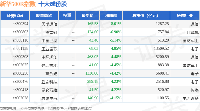 新华500R(489001)指数十大成份股详情如下: