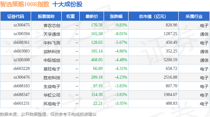证券之星消息,11月11日,智选策略100R(489015)指数报收于4739.35点,跌1.73%,成交1797.51亿元,换手率2.53%。当日该指数成份股中,上涨的有12家,五洲新春以5.4%的涨幅领涨,下跌的有87家,香农芯创以9.83%的跌幅领跌。
