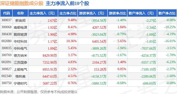资金流向方面,深证储能(970036)指数成份股当日主力资金净流出合计43.51亿元,游资资金净流入合计1.99亿元,散户资金净流入合计41.51亿元。成份股资金流向详情见下表: