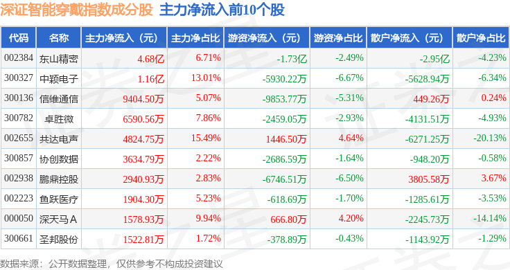 资金流向方面,深证智能穿戴(970074)指数成份股当日主力资金净流出合计44.07亿元,游资资金净流入合计7.63亿元,散户资金净流入合计36.44亿元。成份股资金流向详情见下表: