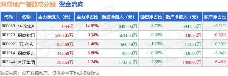 资金流向方面,深成地产(971001)指数成份股当日主力资金净流入合计2.13亿元,游资资金净流出合计1.66亿元,散户资金净流出合计4658.33万元。成份股资金流向详情见下表: