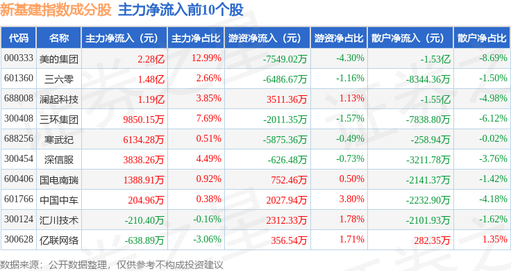 资金流向方面,新基建(980029)指数成份股当日主力资金净流出合计102.78亿元,游资资金净流入合计29.59亿元,散户资金净流入合计73.19亿元。成份股资金流向详情见下表: