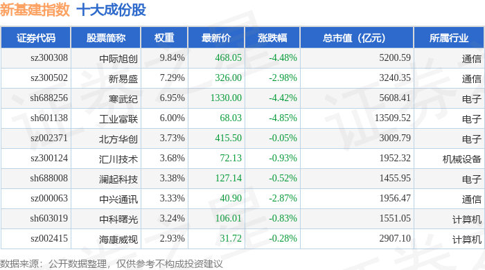 新基建(980029)指数十大成份股详情如下: