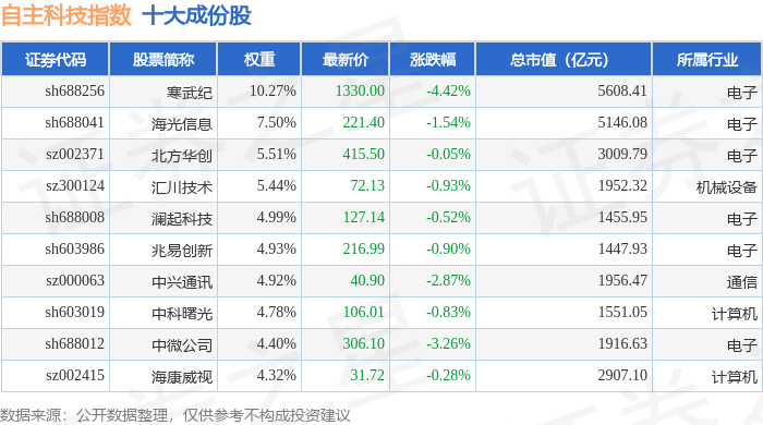 证券之星消息,11月11日,自主科技(980033)指数报收于9106.39点,跌1.72%,成交714.42亿元,换手率1.39%。当日该指数成份股中,上涨的有4家,中航光电以1.08%的涨幅领涨,下跌的有46家,寒武纪以4.42%的跌幅领跌。