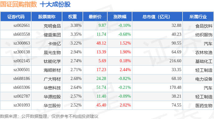 证券之星消息,11月11日,国证回购(980063)指数报收于3462.85点,涨0.95%,成交153.69亿元,换手率1.59%。当日该指数成份股中,上涨的有29家,大名城以10.08%的涨幅领涨,下跌的有18家,智动力以2.83%的跌幅领跌。