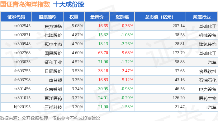 国证青岛海洋(980532)指数十大成份股详情如下: