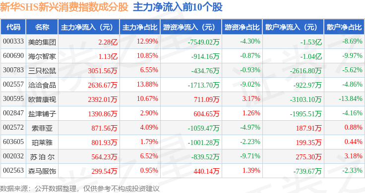 资金流向方面,新华SHS新兴消费(989006)指数成份股当日主力资金净流出合计25.38亿元,游资资金净流入合计10.34亿元,散户资金净流入合计15.04亿元。成份股资金流向详情见下表:
