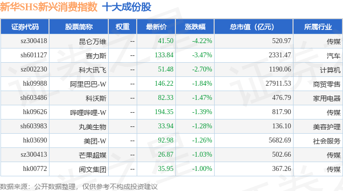 新华SHS新兴消费(989006)指数十大成份股详情如下: