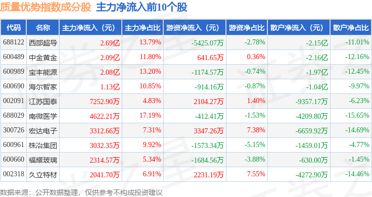 资金流向方面,质量优势(989017)指数成份股当日主力资金净流出合计18.54亿元,游资资金净流入合计8.78亿元,散户资金净流入合计9.77亿元。成份股资金流向详情见下表: