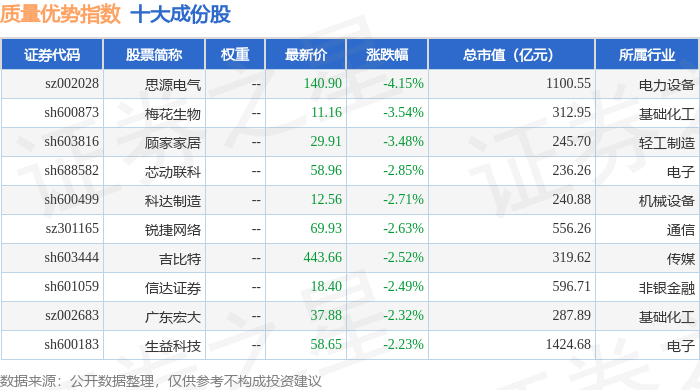 证券之星消息,11月11日,质量优势(989017)指数报收于8119.13点,跌0.37%,成交524.01亿元,换手率0.78%。当日该指数成份股中,上涨的有35家,南微医学以3.89%的涨幅领涨,下跌的有63家,思源电气以4.15%的跌幅领跌。