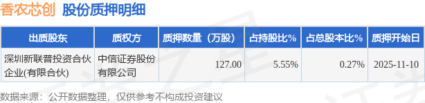 证券之星消息,香农芯创(300475)11月11日公开信息显示,股东深圳新联普投资合伙企业(有限合伙)向中信证券股份有限公司合计质押127.0万股,占总股本0.27%。质押详情见下表: