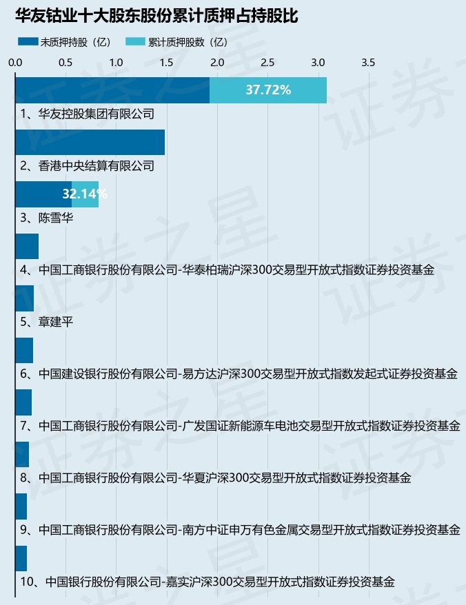 截止本公告日,股东华友控股集团有限公司已累计质押股份1.16亿股,占其持股总数的37.72%,股东陈雪华已累计质押股份2652.0万股,占其持股总数的32.14%。本次质押后华友钴业十大股东的累计质押股份占持股比例(占持股比例的计算以公司最新一期财务报表公布的十大股东的持股总数为基准)见下图: