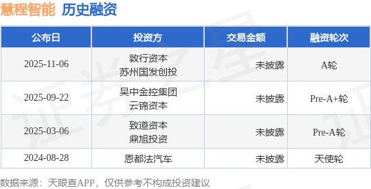 证券之星消息,根据天眼查APP于11月6日公布的信息整理,苏州慧程智能科技有限公司A轮融资,融资额未披露,参与投资的机构包括敦行资本,苏州国发创投。