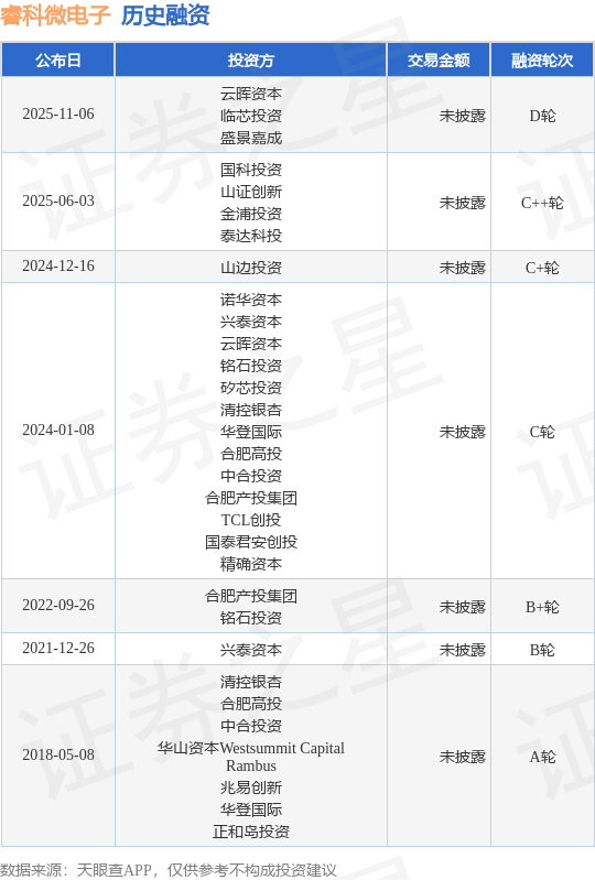 证券之星消息,根据天眼查APP于11月6日公布的信息整理,合肥睿科微电子有限公司D轮融资,融资额未披露,参与投资的机构包括云晖资本,临芯投资,盛景嘉成。