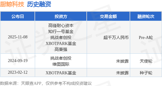 证券之星消息,根据天眼查APP于11月8日公布的信息整理,宁波厨鲸科技有限公司Pre-A轮融资,融资额超千万人民币,参与投资的机构包括高锋耐心资本,知行一号基金,挑战者创投,XBOTPARK基金,高秉强。