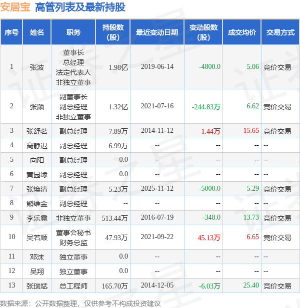 安居宝近半年内的董监高及核心技术人员增减持详情如下: