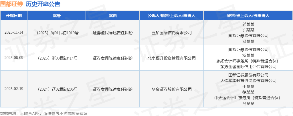 根据统计,近一年内以国都证券股份有限公司为当事人的历史开庭公告有3则,其中案由为“证券虚假陈述责任纠纷”的公告以3则居首。历史开庭公告如下: