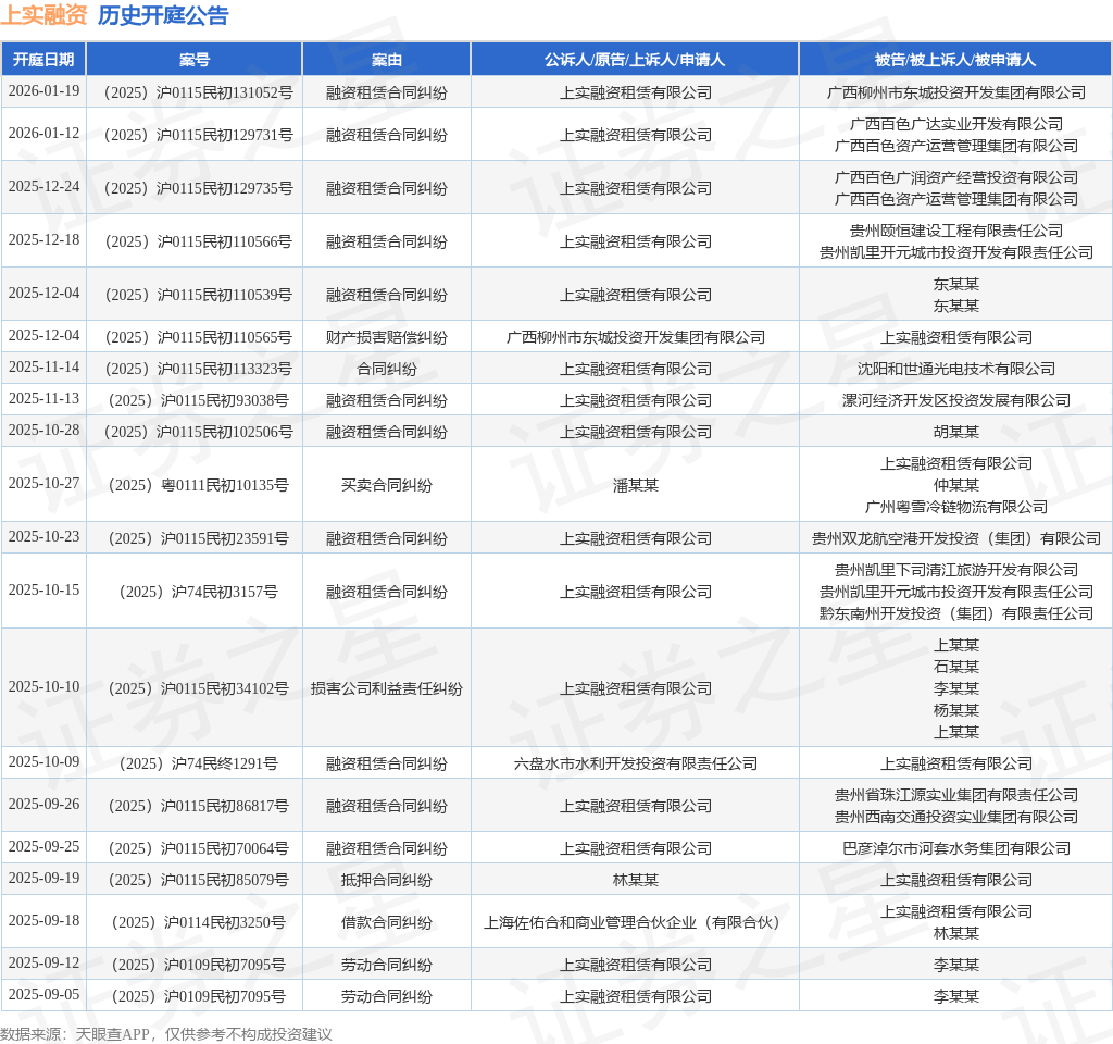 案号:(2025)沪0115民初113323号根据统计,近一年内以上实融资租赁有限公司为当事人的历史开庭公告有65则,其中案由为“融资租赁合同纠纷”的公告以25则居首,其次为“劳动合同纠纷”有6则,“劳动争议”有6则。历史开庭公告(前20条)如下: