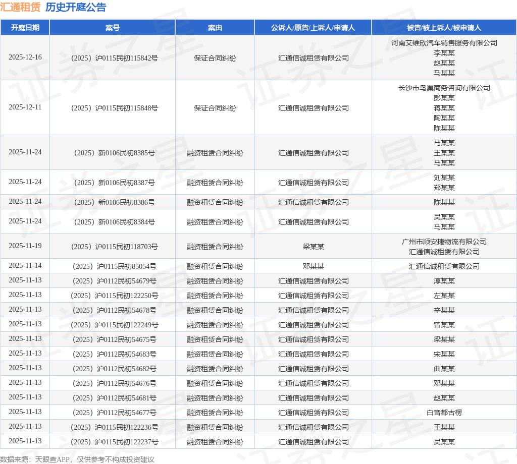 案号:(2025)沪0115民初85054号根据统计,近一年内以汇通信诚租赁有限公司为当事人的历史开庭公告有743则,其中案由为“融资租赁合同纠纷”的公告以691则居首,其次为“保证合同纠纷”有18则,“合同纠纷”有10则。历史开庭公告(前20条)如下: