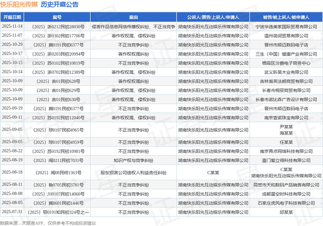 案号:(2025)浙0212民初28030号根据统计,近一年内以湖南快乐阳光互动娱乐传媒有限公司为当事人的历史开庭公告有102则,其中案由为“不正当竞争纠纷”的公告以56则居首,其次为“侵害作品信息网络传播权纠纷”有25则,“著作权权属、侵权纠纷”有8则。历史开庭公告(前20条)如下: