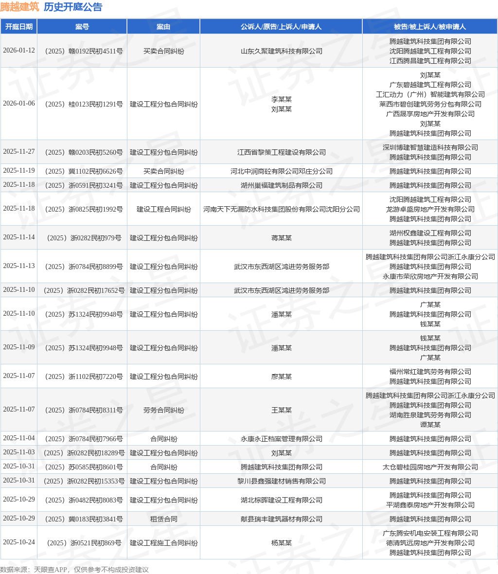 案号:(2025)浙0282民初979号根据统计,近一年内以腾越建筑科技集团有限公司为当事人的历史开庭公告有417则,其中案由为“买卖合同纠纷”的公告以82则居首,其次为“建设工程施工合同纠纷”有76则,“劳务合同纠纷”有59则。历史开庭公告(前20条)如下:
