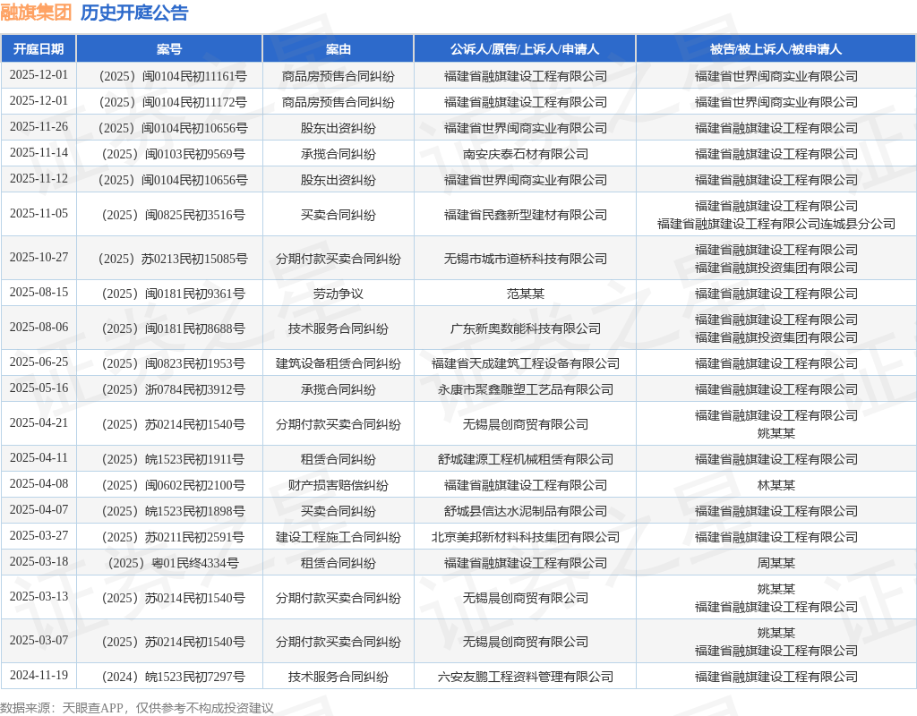 案号:(2025)闽0103民初9569号根据统计,近一年内以福建省融旗建设工程有限公司为当事人的历史开庭公告有22则,其中案由为“分期付款买卖合同纠纷”的公告以4则居首,其次为“买卖合同纠纷”有3则,“租赁合同纠纷”有3则。历史开庭公告(前20条)如下: