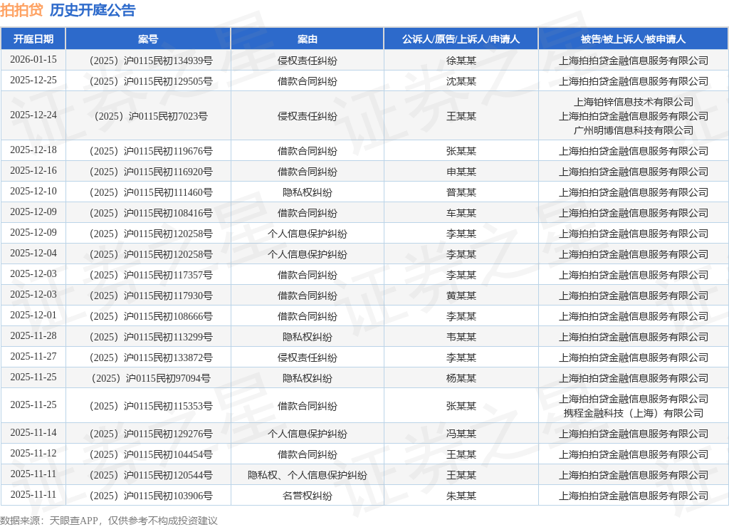 案号:(2025)沪0115民初129276号根据统计,近一年内以上海拍拍贷金融信息服务有限公司为当事人的历史开庭公告有94则,其中案由为“侵权责任纠纷”的公告以21则居首,其次为“借款合同纠纷”有19则,“个人信息保护纠纷”有9则。历史开庭公告(前20条)如下: