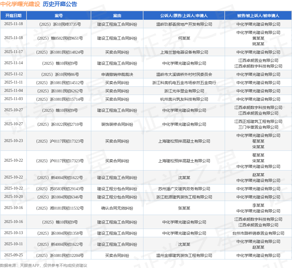 案号:(2025)赣10民初9号根据统计,近一年内以中化学曙光建设有限公司为当事人的历史开庭公告有112则,其中案由为“建设工程施工合同纠纷”的公告以29则居首,其次为“买卖合同纠纷”有25则,“建设工程分包合同纠纷”有15则。历史开庭公告(前20条)如下: