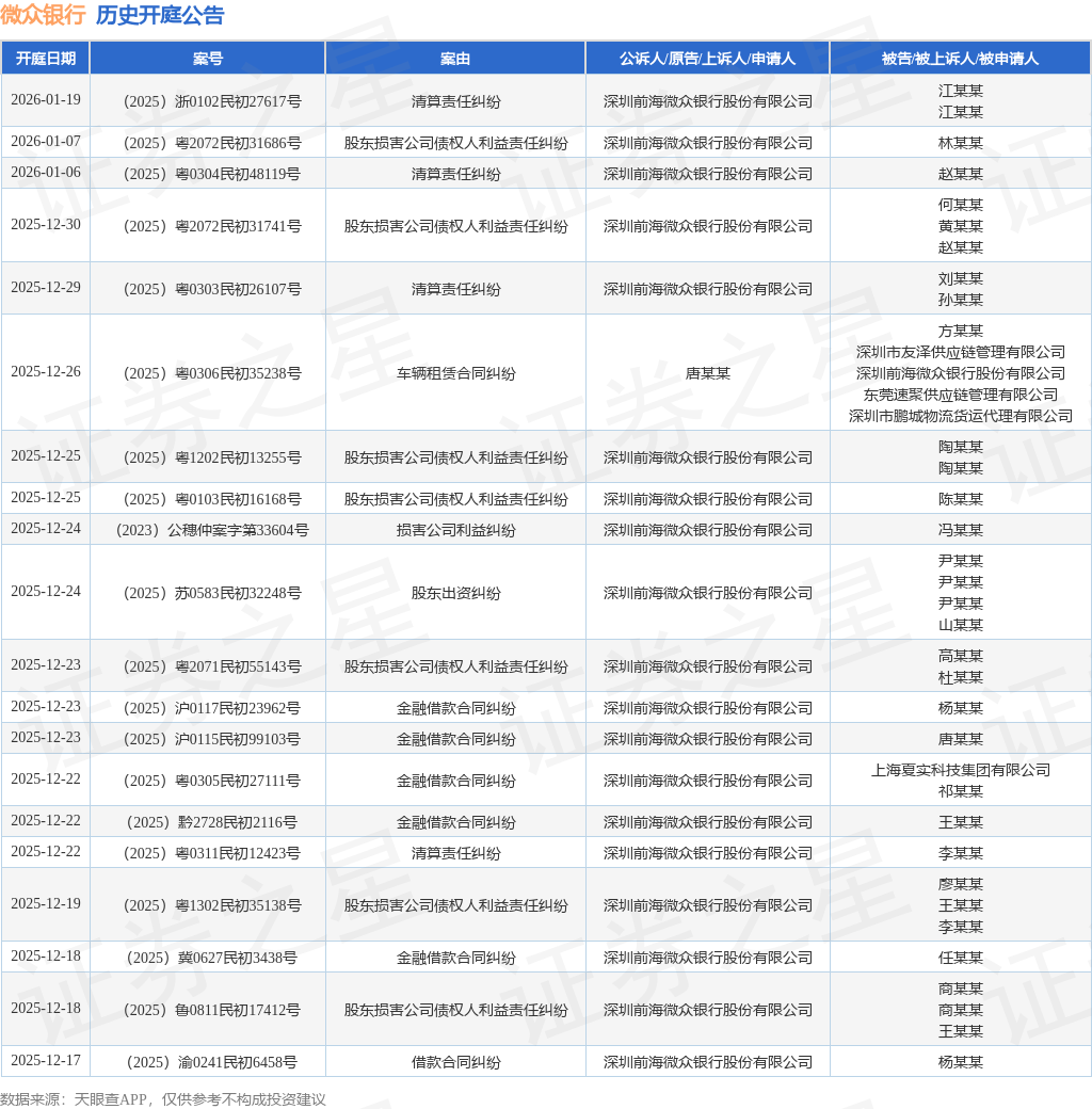 案号:(2025)粤0105民初26036号根据统计,近一年内以深圳前海微众银行股份有限公司为当事人的历史开庭公告有1801则,其中案由为“金融借款合同纠纷”的公告以1285则居首,其次为“清算责任纠纷”有137则,“股东损害公司债权人利益责任纠纷”有103则。历史开庭公告(前20条)如下: