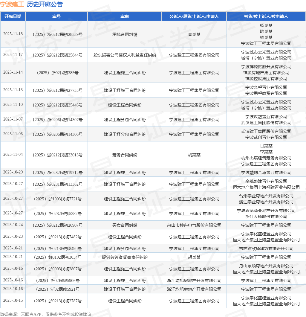 案号:(2025)浙02民初385号根据统计,近一年内以宁波建工工程集团有限公司为当事人的历史开庭公告有127则,其中案由为“建设工程施工合同纠纷”的公告以31则居首,其次为“买卖合同纠纷”有29则,“建设工程合同纠纷”有20则。历史开庭公告(前20条)如下: