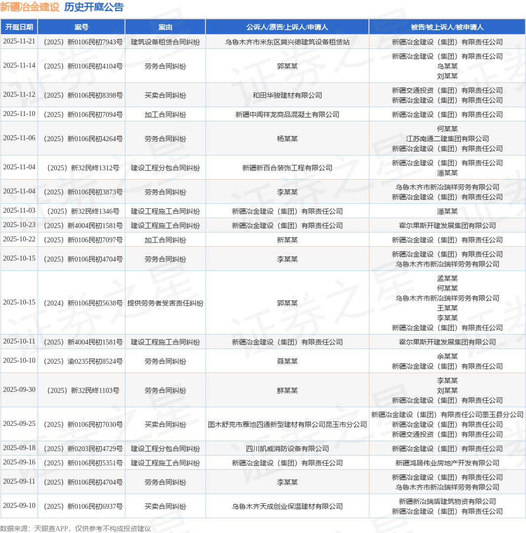 案号:(2025)新0106民初4104号根据统计,近一年内以新疆冶金建设(集团)有限责任公司为当事人的历史开庭公告有127则,其中案由为“买卖合同纠纷”的公告以28则居首,其次为“建设工程施工合同纠纷”有22则,“劳务合同纠纷”有21则。历史开庭公告(前20条)如下: