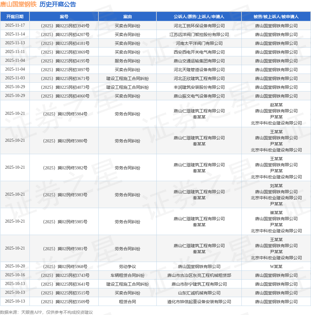 案号:(2025)冀0225民初4207号根据统计,近一年内以唐山国堂钢铁有限公司为当事人的历史开庭公告有177则,其中案由为“买卖合同纠纷”的公告以113则居首,其次为“建设工程施工合同纠纷”有21则,“劳动争议”有19则。历史开庭公告(前20条)如下: