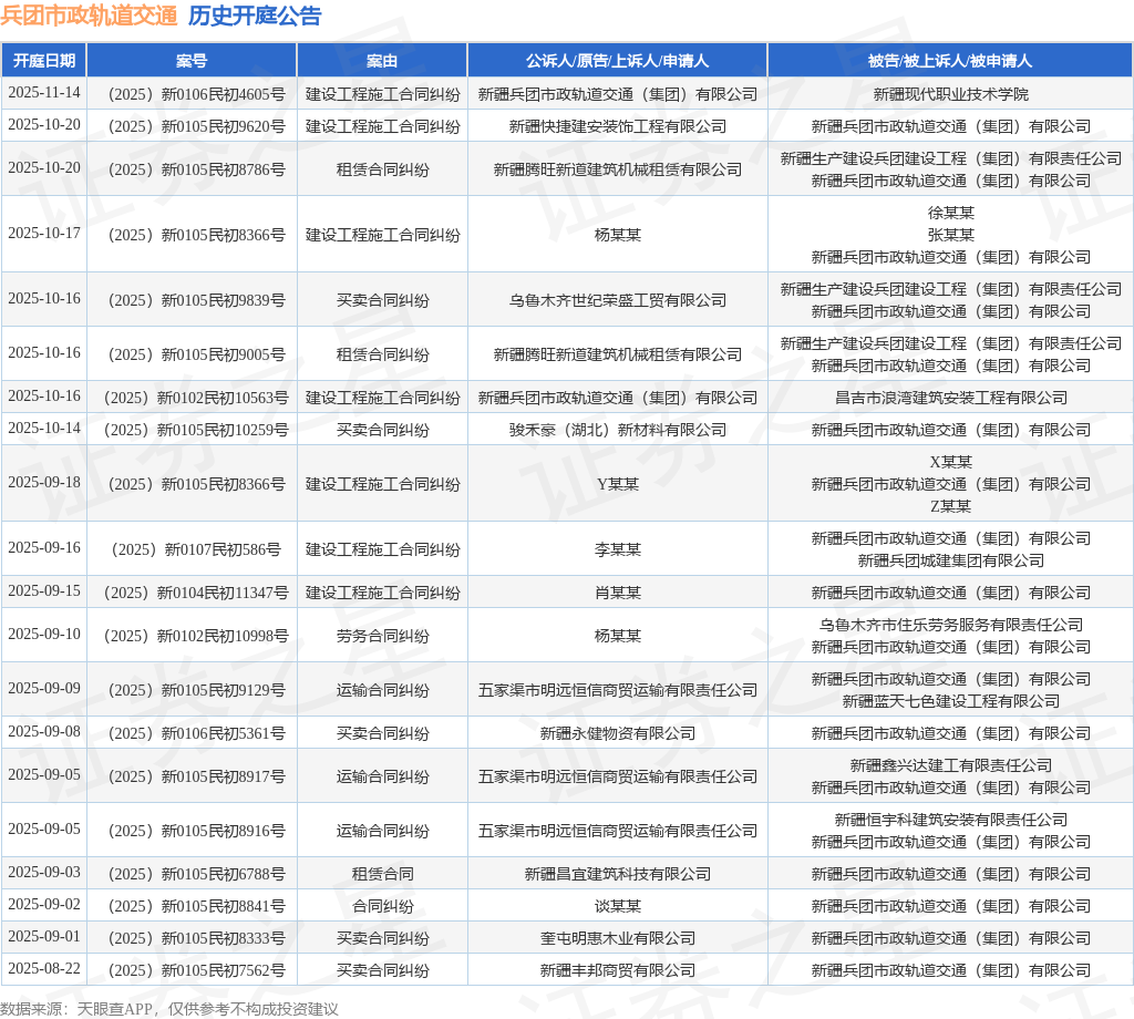 案号:(2025)新0106民初4605号根据统计,近一年内以新疆兵团市政轨道交通(集团)有限公司为当事人的历史开庭公告有63则,其中案由为“买卖合同纠纷”的公告以28则居首,其次为“建设工程施工合同纠纷”有12则,“建设工程合同纠纷”有3则。历史开庭公告(前20条)如下: