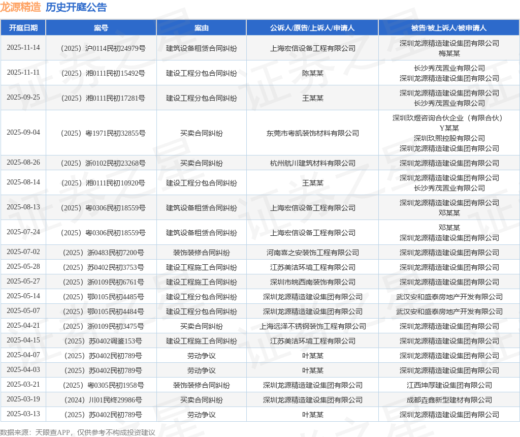 案号:(2025)沪0114民初24979号根据统计,近一年内以深圳龙源精造建设集团有限公司为当事人的历史开庭公告有31则,其中案由为“买卖合同纠纷”的公告以9则居首,其次为“建设工程分包合同纠纷”有5则,“建设工程施工合同纠纷”有5则。历史开庭公告(前20条)如下: