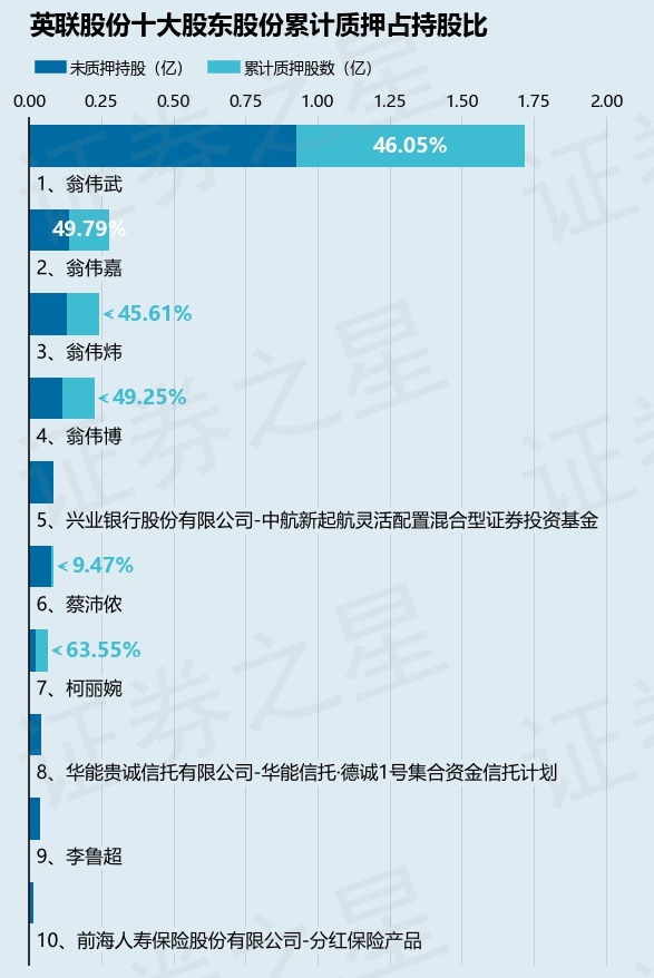 截止本公告日,股东翁伟武已累计质押股份7909.83万股,占其持股总数的46.05%,股东翁伟嘉已累计质押股份1392.0万股,占其持股总数的49.79%,股东翁伟炜已累计质押股份1112.1万股,占其持股总数的45.61%,股东翁伟博已累计质押股份1112.0万股,占其持股总数的49.25%,股东蔡沛侬已累计质押股份80.0万股,占其持股总数的9.47%,股东柯丽婉已累计质押股份410.0万股,占其持股总数的63.55%。本次质押后英联股份十大股东的累计质押股份占持股比例(占持股比例的计算以公司最新一期财务报表公布的十大股东的持股总数为基准)见下图: