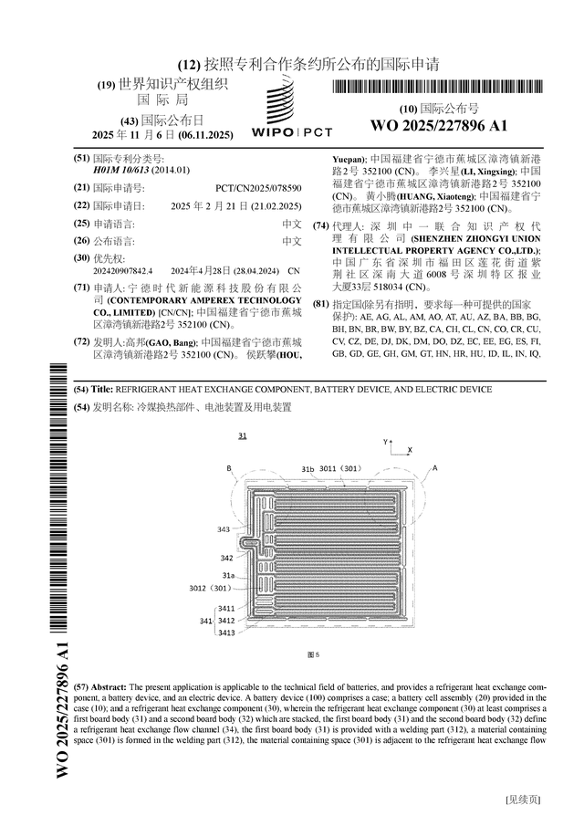 证券之星消息,根据企查查数据显示宁德时代(300750)公布了一项国际专利申请,专利名为“冷媒换热部件、电池装置及用电装置”,专利申请号为PCT/CN2025/078590,国际公布日为2025年11月6日。
