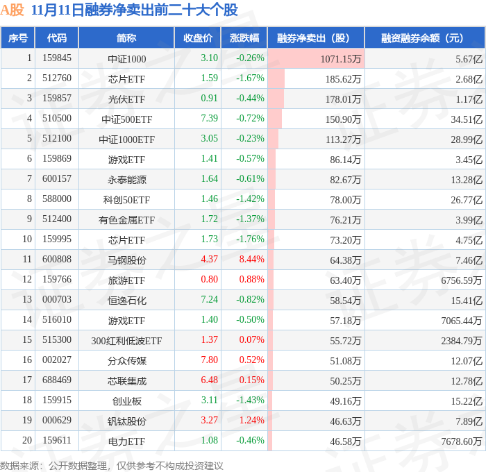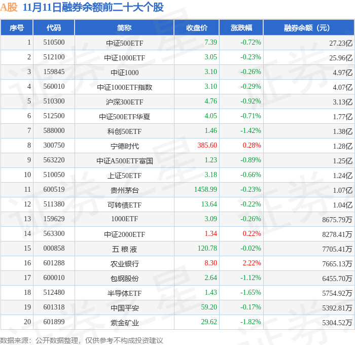 A股融券余额前三分别为:中证500ETF(510500)融券余额27.23亿元、中证1000ETF(512100)融券余额25.96亿元、中证1000(159845)融券余额4.97亿元,前20具体见下表: