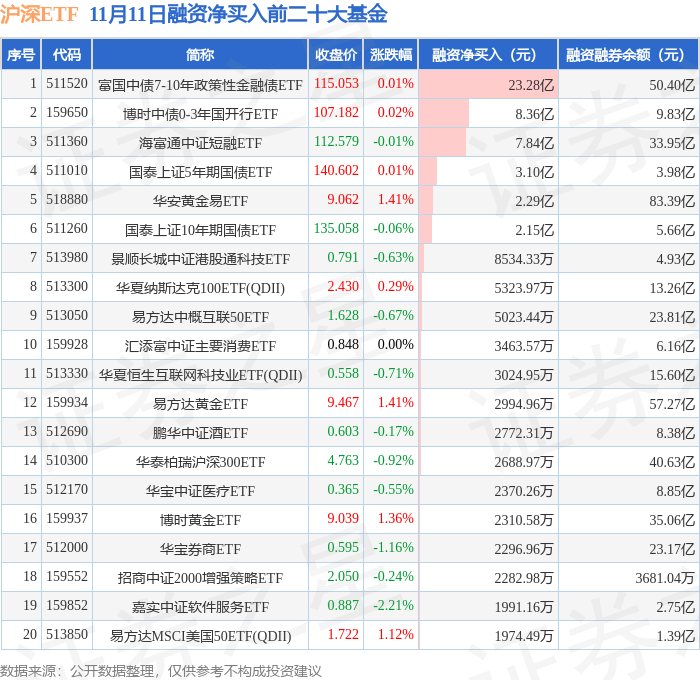 沪深ETF融资净买入前三分别为:富国中债7-10年政策性金融债ETF(511520)融资净买入23.28亿元、博时中债0-3年国开行ETF(159650)融资净买入8.36亿元、海富通中证短融ETF(511360)融资净买入7.84亿元,前20具体见下表:
