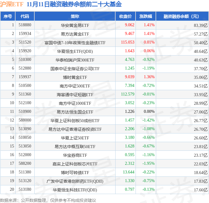 沪深ETF融资融券余额前三分别为:华安黄金易ETF(518880)融资融券余额83.39亿元、易方达黄金ETF(159934)融资融券余额57.27亿元、富国中债7-10年政策性金融债ETF(511520)融资融券余额50.4亿元,前20具体见下表:
