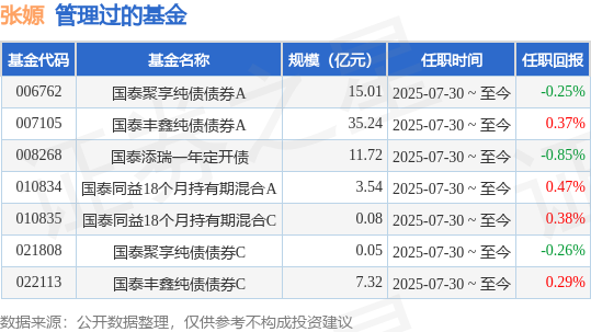 张嫄女士:中国国籍,硕士研究生。2018年6月加入国泰基金,历任债券交易员、基金经理助理等。2025年7月30日担任国泰同益18个月持有期混合型证券投资基金、国泰聚享纯债债券型证券投资基金、国泰添瑞一年定期开放债券型发起式证券投资基金、国泰丰鑫纯债债券型证券投资基金基金经理。