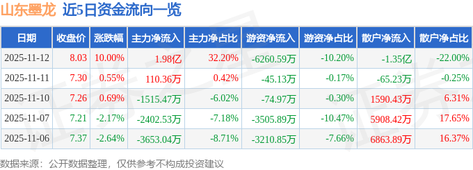 证券之星消息,山东墨龙11月12日涨停收盘,收盘价8.03元。该股于9点42分涨停,未打开涨停,截止收盘封单资金为1.32亿元,占其流通市值3.03%。