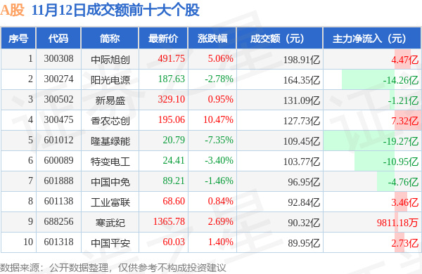 当日A股成交额前10大个股中6只个股收涨,平均涨幅3.57%,其中中际旭创(300308)以成交额198.91亿元排第一。从主力资金流入看,成交额前10大个股中有5只个股呈现主力资金净流入。