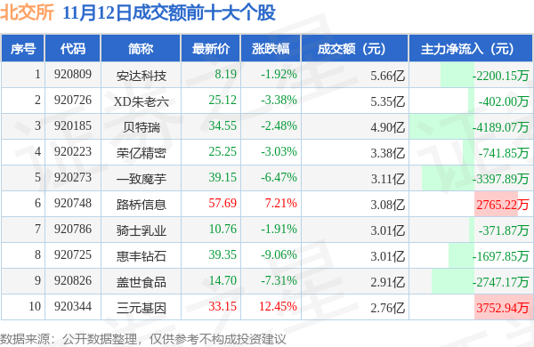 当日北交所成交额前10大个股中2只个股收涨,平均涨幅9.83%,其中安达科技(920809)以成交额5.66亿元排第一。从主力资金流入看,成交额前10大个股中有2只个股呈现主力资金净流入。